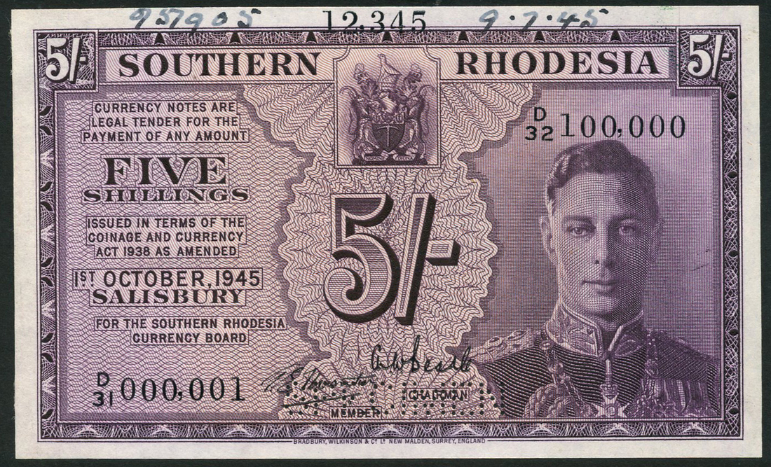 (†) Southern Rhodesia Currency Board, printer's archival specimen 5 shillings, 1 February 1945, serial number D31 000,001/D32 100,000, purple, portrait King George VI at right, arms top centre, reverse, denomination in ornate tablet at centre
