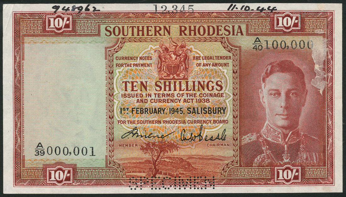 (†) Southern Rhodesia Currency Board, printer's archival specimen 10 shillings (2), 1 February 1945, serial numbers A/39 000,001/A/40 100,001 and A/41 000,001/A/42 100,000, russet brown on multicolour, portrait King George VI at right, arms top centre and landscape at low centre, reverse, Victoria Falls at centre, sable at right