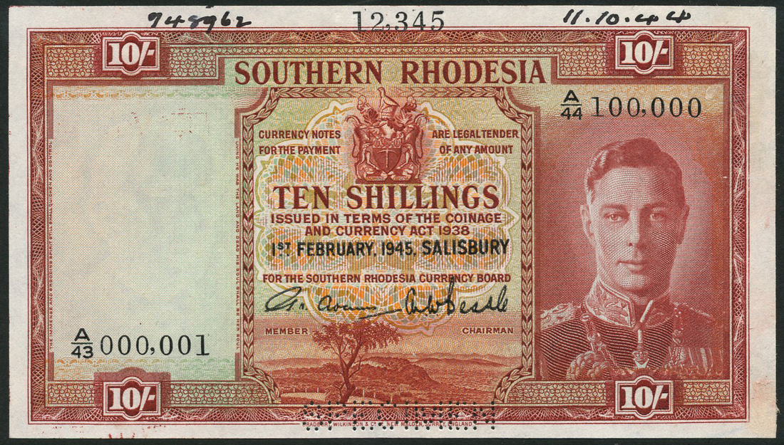 (†) Southern Rhodesia Currency Board, printer's archival specimen 10 shillings (2), 1 February 1945, serial numbers A/43 000,001/A/44 100,000 and A/45 000,001/A/46 100,000, russet brown on multicolour, portrait King George VI at right, landscape scene low centre, arms top centre, the A/45 Tucker and Beadle signatures, reverse, Victoria Falls at centre, sable at left