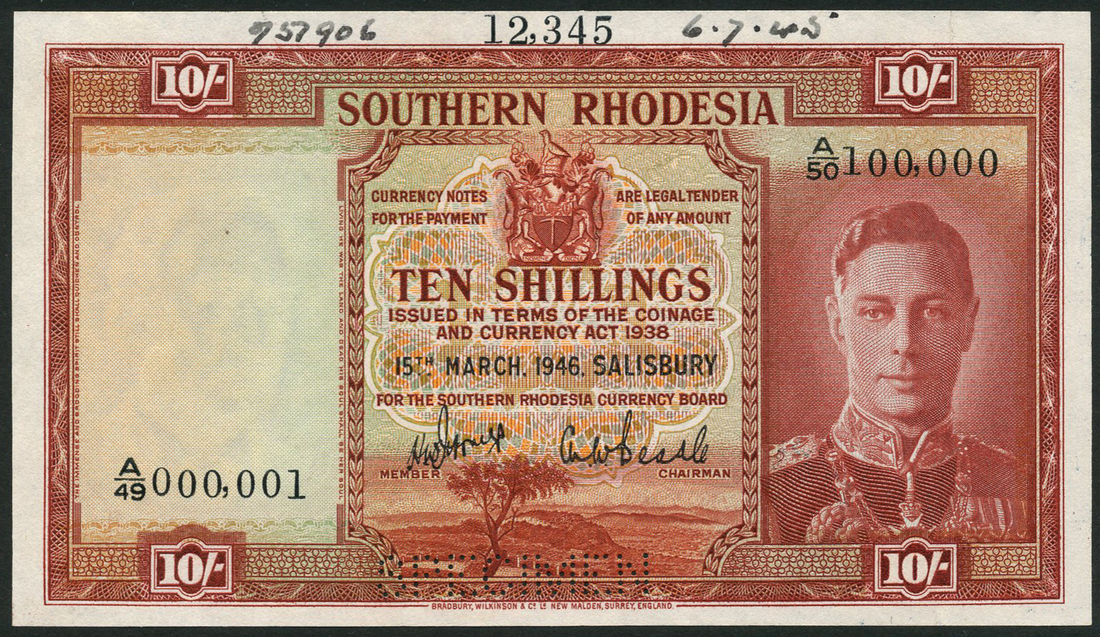 (†) Southern Rhodesia Currency Board, printer's archival specimen 10 shillings (3), 15 March 1946, serial numbers A/47 000,001/A/48 100,000, A/49 000,001/A/5- 100,000 and A/51 000,001/A/52 100,000, russet and multicolour, portrait King George VI at left, arms top centre, landscape scene low centre, reverse, Victoria Falls, sable at right