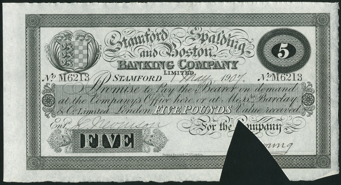 Stamford Spalding and Boston Banking Company, £5, 1 May 1907, serial number M6213, black and white, arms top left, value top right low left and in black tablet at centre