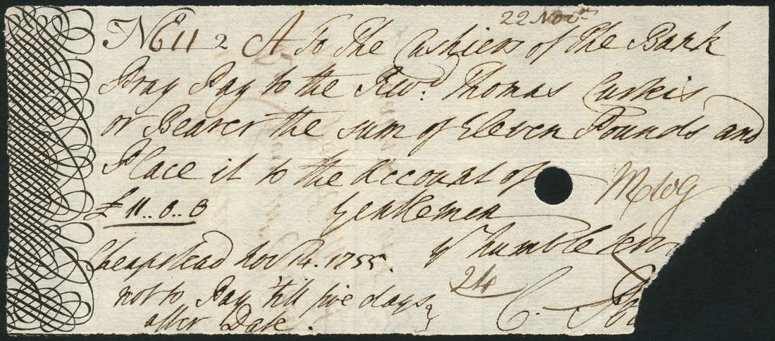 Bank of England Cheque, 22 November 1755, number 611, in the sum of £11 payable to Revd Thomas Carkies, signature removed to indicate cancellation, early colour cheque device on reverse at right