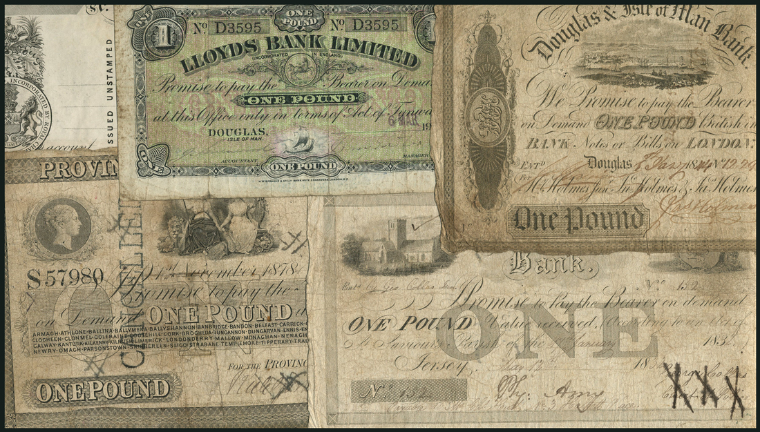 a mixed group of notes, comprising, Douglas and Isle of Man Bank, £1, 1844, black, harbour view top centre, reverse, bank arms at centre, Lloyds Bank Limited, £1, 1949, black on light green and mauve underprint, horse in panel with vignette of Viking ship low centre, reverse, pink and blue, triune at centre, St Saviour's Bank, Jersey, £1, 1832, church top left, lion and shield top right, Provincial Bank of Ireland, £1, 1878, Britannia and Hibernia top centre, also National Bank of Scotland cheque and North British Bank copy of specimen £5
