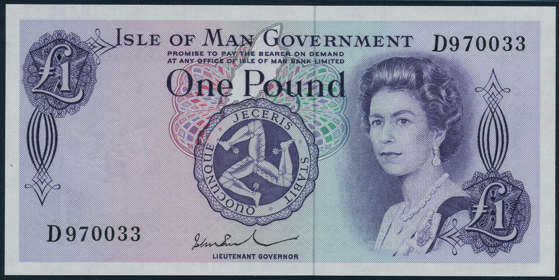 Isle of Man Government, £1, ND (1972), serial number D970033, purple on multicolour underprint, Elizabeth II at right, arms at centre, reverse Tynwald Hill, John Paul signature
