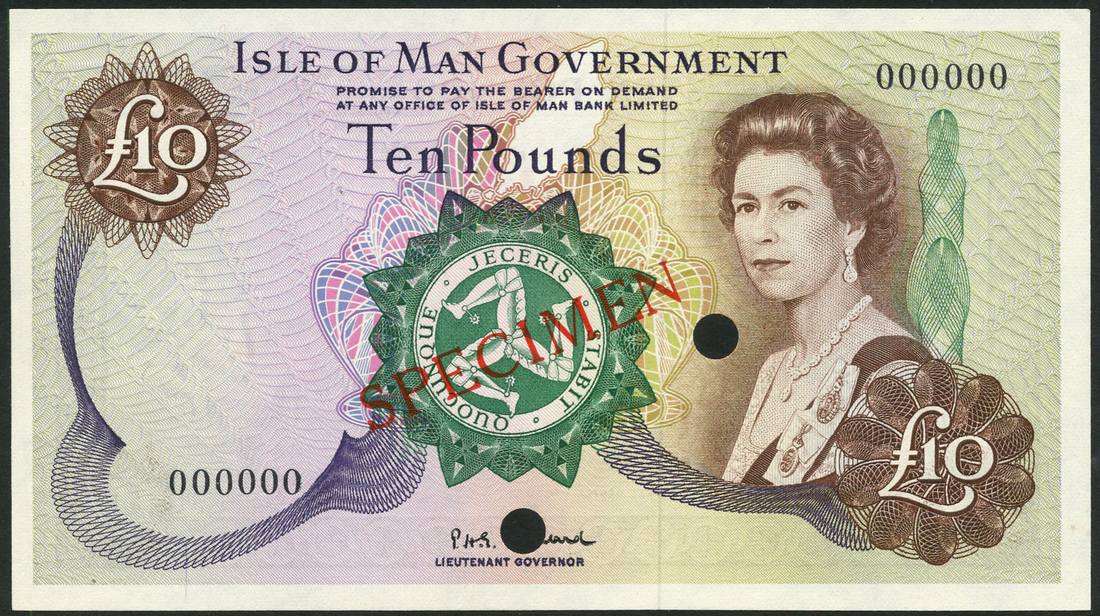 Isle of Man Government, specimen £10, ND (1972), zero serial numbers, brown and green on multicolour, portrait Queen Elizabeth II at right, triune at centre, Stallard signature, value top left, centre and low right, reverse, brown and orange, Peel Castle at centre, also States of Jersey £1 (2), £10 and £20