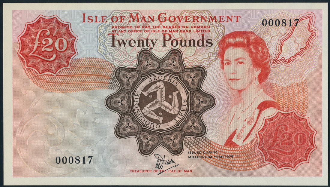 Isle of Man Government, £20, ND (1979), serial number 000817, red and brown on multicolour underprint, Elizabeth II at right, arms at centre, reverse Laxey Wheel, Dawson signature