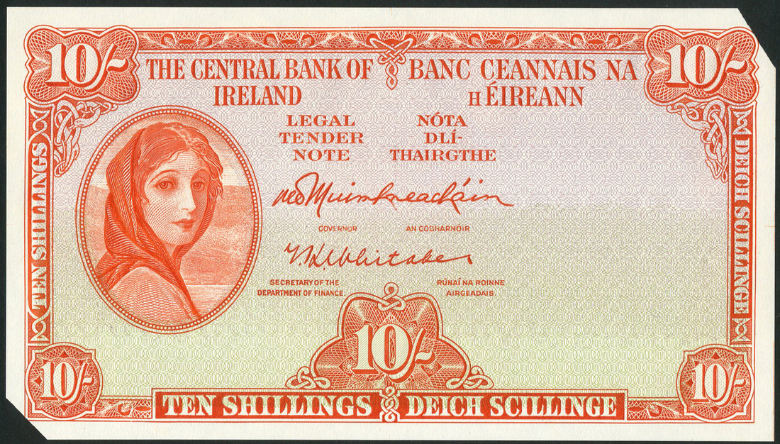 (†) Central Bank of Ireland, a proof 10 shillings, ND (ca 1966), orange and pale green, Lady Lavery at left, Muimhneachain and Whitaker signatures, reverse green, River Blackwater mask at centre, also five partial backgrounds