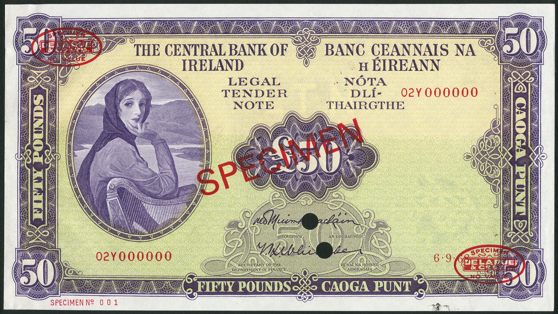 (†) Central Bank of Ireland, specimen £50, 6 September 1968, serial number 02Y 000000, O'Muimhneachain and Whitaker signatures, purple on pale yellow and pale green underprint, Lady Hazel Lavery in Irish national costume leaning on a harp in oval at left, value at lower centre and in each corner, reverse mask of River Shannon at centre, scalloped borders with guilloches in each corner, overprinted SPECIMEN in red with two De La Rue specimen ovals on obverse and reverse, SPECIMEN No 1 at lower left, two punch holes