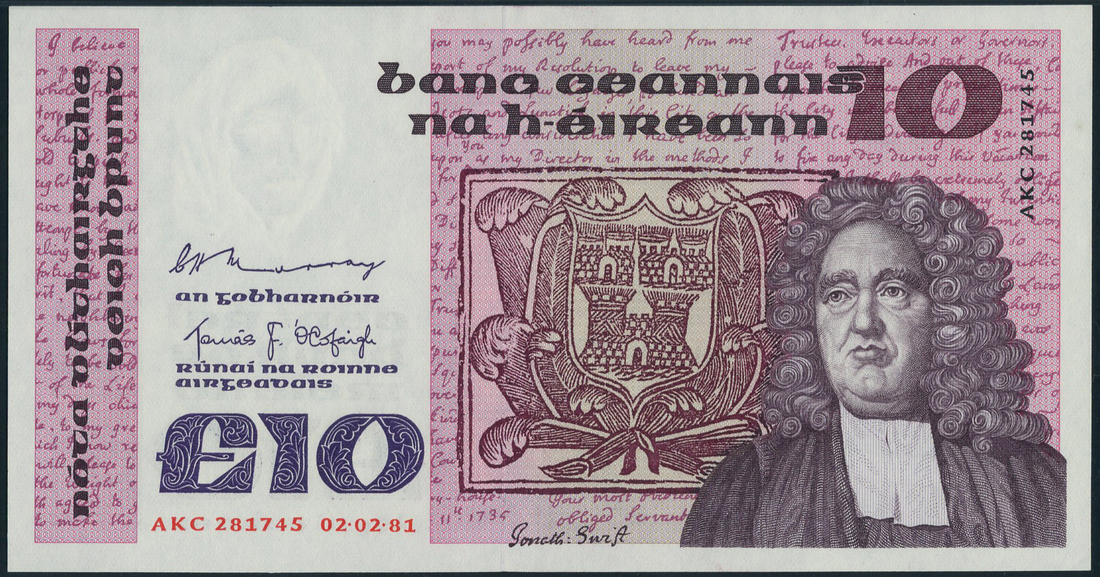 Central Bank of Ireland, £10, 2 February 1981, serial number AKC 281745, purple on pink and green underprint, Jonathan Swift at right, reverse Map of Dublin