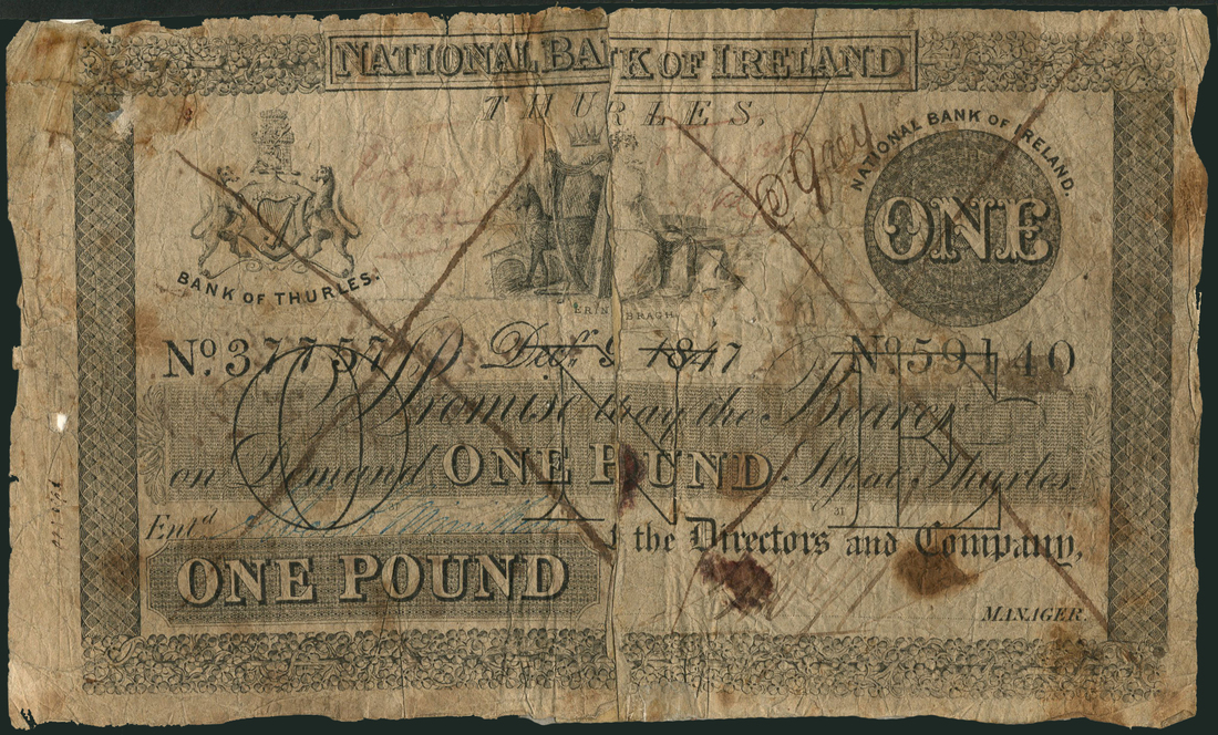 National Bank of Ireland, £1, Thurles, 9 December 1847, serial numbers 37757/59140, black and white, Hibernia, harp and wolf-hound top centre, arms top left of the Bank of Thurles, two manuscript signatures below