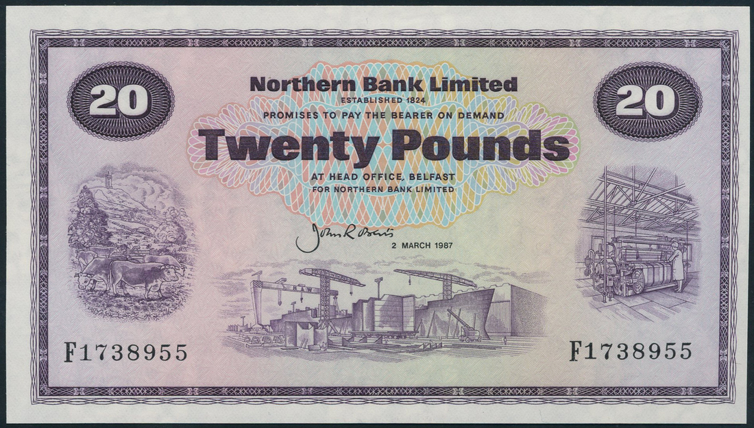(x) Northern Bank Limited, £20, 2 March 1987, serial number F1738955, purple on multicolour underprint, scenes of agriculture, shipbuilding and weaving, J. Roberts signature variety