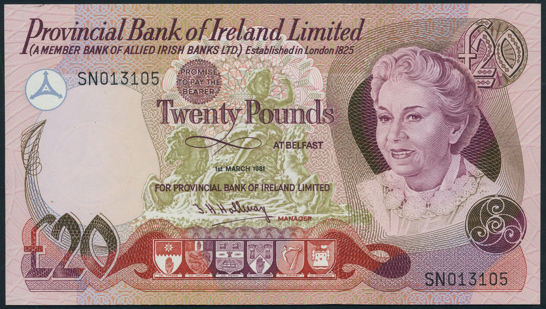 Provincial Bank of Ireland, £20, 1 March 1981, serial number SN013105, maroon and multicolour, portrait of a lady at right, Hallway signature, reverse rock pillar at Lacada Point