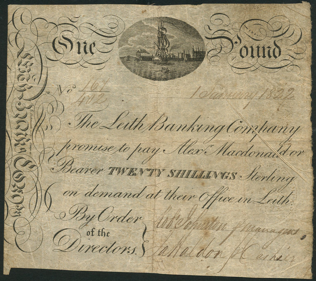Leith Banking Company, 20/-, 1 January 1822, serial number 167/402, black and white, sailing ship entering Leith in oval vignette at top centre, bank title in vertical panel at left, pay to 'Alex Macdonald' in text at centre, two manuscript signatures low right