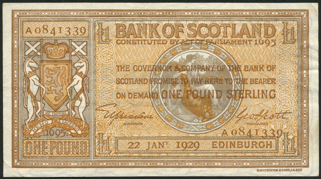 Bank of Scotland, £1 (3), 22 January 1929, 14 November 1929 and 6 August 1931, serial numbers A0841339, D0553668 and G0174587, light tan and grey, bank arms at left, bank title top centre, allegorical maiden in circular frame at centre, reverse, grey, bank head office