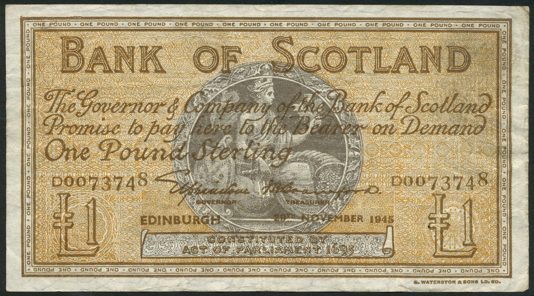 Bank of Scotland, £1 (4), all 1945, serial numbers A0157905, A0059474, A0754348, D0073748, light tan and grey, bank arms at left, bank title top centre, allegorical maiden in circular frame at centre, reverse, brown, arms at centre flanked by value