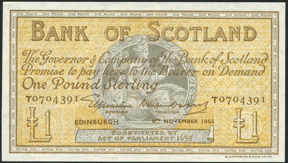 Bank of Scotland, £1 (2), 9 November 1953 and 21 November 1961, serial numbers T0704391 and D0787043, first, tan and grey, second, tan and blue, both bank title along top margin, allegorical maiden in circular frame at centre