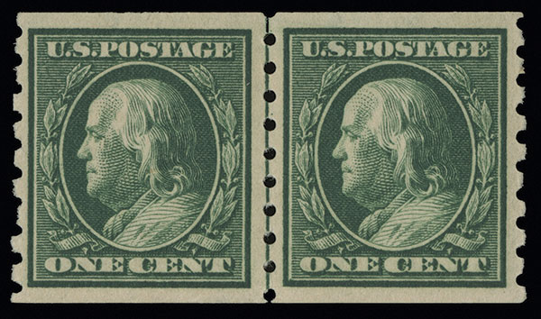 #392, 1c Green coil, perf. 8 ½ vert., guide line pair, brilliantly fresh and crisp, luxuriously rich color, quite well centered, unblemished o.g., never hinged, nearly very fine; 1988 PF certificate.