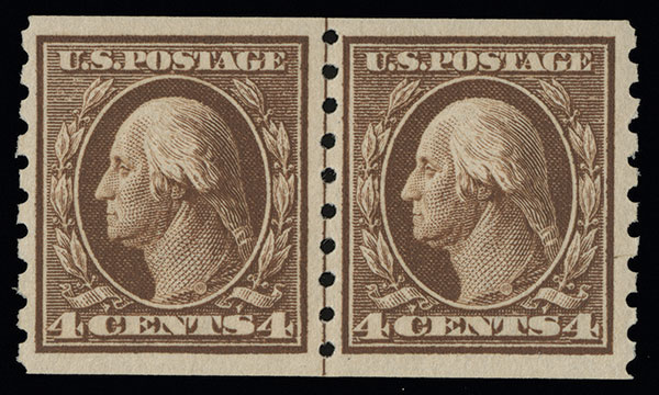 #395, 4c Brown coil, perf. 8 ½ vert. guide line pair, post office fresh, sumptuously rich color, o.g., never hinged, very fine; 1987 PF certificate.