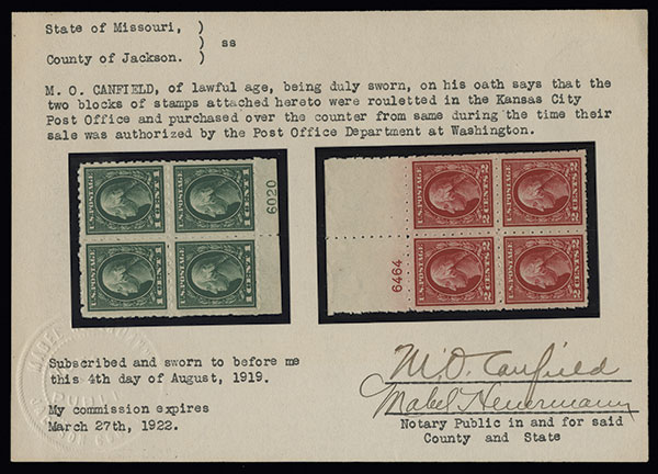 #408-09 vars., 1c Green and 2c Carmine, with "Kansas City" roulettes, blocks of four with plate numbers 6020 and 6464 respectively, brilliantly fresh, o.g., 1c l.h. in top pair, 2c n.h., well centered and very fine; these are a legitimate variety that was approved by the Post Office Department and sold over the counter at the Kansas City Post Office; each with "WW" handstamp on the back of one stamp, the 1c also initialed "ERW" and the 2c "MOC" on the same stamp, all are recognized as signatures of authenticity and accompanied by a 1922 notarized letter of authenticity by M.O. Canfield.