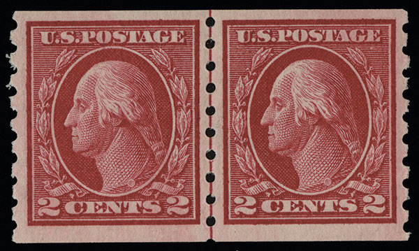#413, 2c Carmine coil, Ty. I, perf. 8 ½ vert., guide line pair, intense color on fresh paper, well centered within large margins, o.g., never hinged, very fine; 1997 PF certificate.