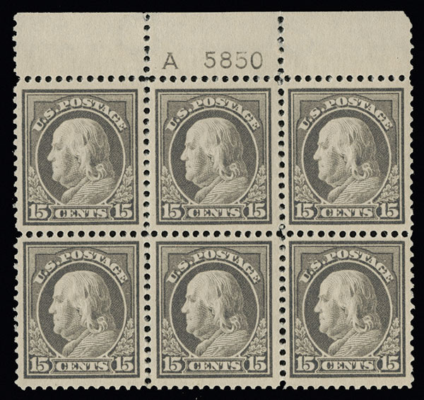 #418, 15c Gray, top margin letter "A" and plate no. 5850 block of six, exceptionally well centered, strong color and impression, o.g., top right stamp is never hinged, extremely fine; 2013 PSE certificate..