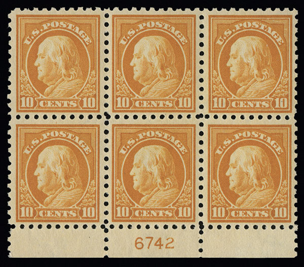 #433, 10c Orange yellow, bottom margin plate no. 6742 block of six, overall quite well centered throughout and possessing bright color, crisp and intact, o.g., l.h. in top right and bottom left stamps, the rest are n.h., very fine; 2013 PF certificate.