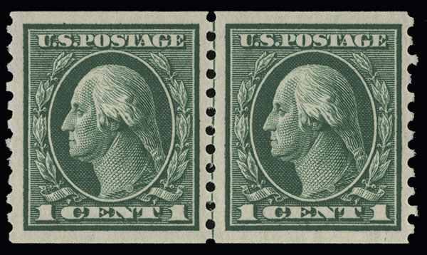 #443, 1c Green flat plate coil, perf. 10 vert., attractive guide line pair, well centered and margined, rich color, o.g., never hinged, very fine; a difficult coil to find genuine; 1993 PF certificate.