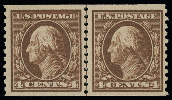 #446, 4c Brown flat plate coil, perf. 10 vert., guide line pair, well centered and margined, strong rich color, o.g., l.h., very fine; 2013 PSE certificate.