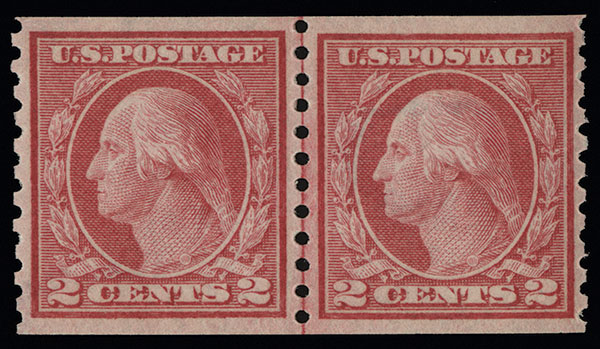 #454, 2c Red rotary coil, Ty. II, perf. 10 vert., attractive joint line pair, well centered, bright and fresh, o.g., never hinged, very fine and choice; 1994 PF certificates.