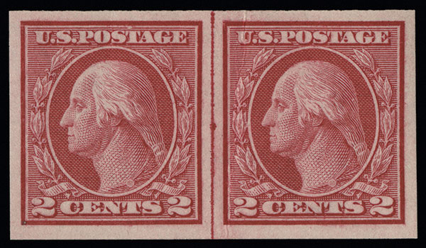 #459, 2c Carmine imperforate coil, scarce joint line pair, large margins all around, o.g., never hinged, usual vertical production crease between stamps and affecting the right stamp, extremely fine; 1976 PF certificate.
