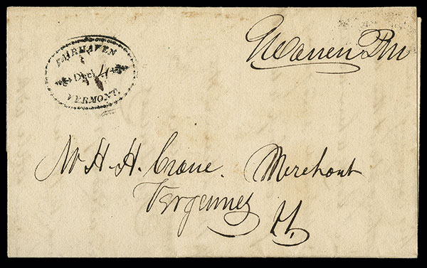 "Fairhaven/Vermont/Dec 4"dotted oval with ornaments at sides of date and ms. "4," a very pretty marking on 1824 entire folded letter to Vergennes, Vt., postmaster frank, very fine.