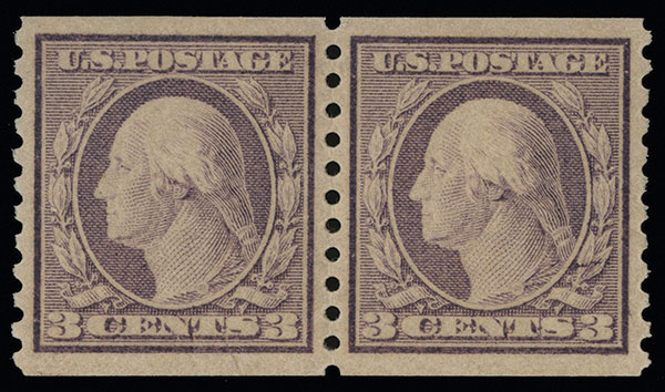 #493, 3c Violet coil, Ty. I, perf. 10 vert., mint pair, excellent centering within large margins, rich color, o.g., n.h., extremely fine; an especially choice pair of this rotary coil; 2013 PSE certificate (XF-Superb 95; SMQ $325.00).