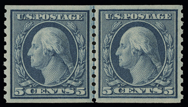 #496, 5c Blue coil, perf. 10 vert., joint line pair, exceptionally well centered within wide margins, deep rich color, o.g., n.h., extremely fine and choice; 2011 PF certificate (XF-Superb 95; SSV $200.00).