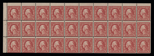 #499f, 2c Rose, Ty. I, A.E.F. booklet pane of thirty, a fresh pane, centered to bottom, stamps o.g., n.h. except two at right and left centers, an affordable example of this great booklet pane rarity, very good.