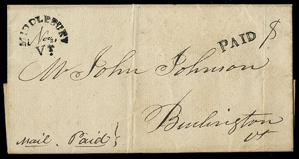 "Middlebury/Vt" arc pmk. with ms. "Nov. 21" date, beautiful strike of this very rare marking on 1810 entire folded letter to Burlinton, Vt., matching light strike of "Paid" h.s. that has been enhanced and ms. "8" rate and "Mail Paid" a bottom right, vitriolic letter relating to thievery of lumber, very fine and rare Vermont marking.