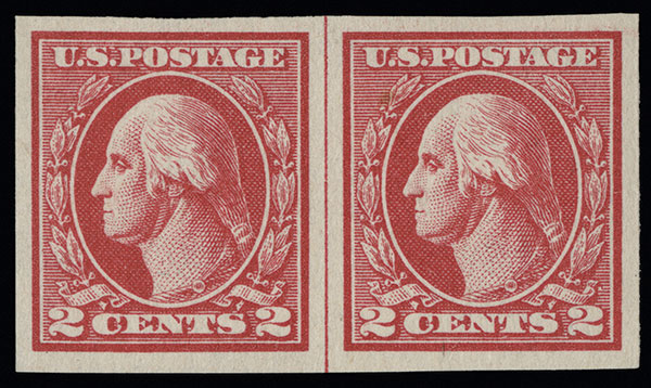 #533, 2c Carmine offset imperforate, Ty. V, horizontal guideline pair, large balanced margins all around, fresh color, o.g., never hinged, extremely fine; 2000 PF certificate.