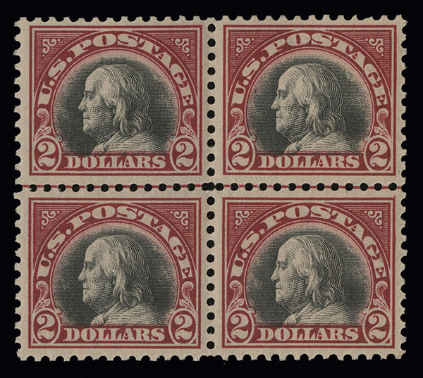 #547, $2.00 Carmine and black, mint block of four with horizontal guide line, rich vibrant colors, well centered, o.g., n.h., small pencil number on the gum of the bottom right stamp, very fine; catalog value is for four n.h. singles.