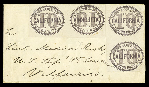 #11L3a, Berford & Co.'s Express, New York, N.Y., 10c Violet, horizontal Tete-Beche Pair, used with 10c Violet (#11L3) vertical pair on cover addressed "For Lieut. Madison Rush, U.S. Ship 'St. Lawrence' Valparaiso", the address tying the vertical pair, both pairs with large margins, docketing on back "Recd. at Valparaiso, March 21st, 1852", wonderfully fresh and very fine.