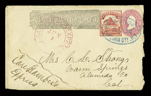 #143L9, Wells, Fargo & Co., 25c Red, single with three clear to ample margins, just along the frame at left, tied to 3c Pink on white postal entire (#U34) with Wells, Fargo & Co. Paid printed frank by blue "Wells, Fargo & Co./Virginia City/May 30" oval, manuscript in bottom left corner "Care Bamber's Express". and red "Bamber's Express Co/Jun 1" circular handstamp, this cover is posted to the writer of the three previous Wells, Fargo covers who is now in Warm Springs, Cal. and written by her Brother in Virginia City requiring the conjunctive use of both express companies, with original enclosure, cover opened irregularly at right not affecting stamps or markings, very fine usage; the 25c Red is the scarcest value on cover of the three Virginia City Pony Express values but is incredibly rare used in conjunction with another express company with only a few examples known; 2013 PF certificate