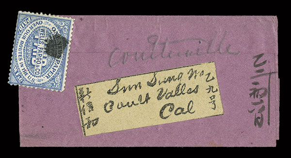 #143LP9, Wells, Fargo & Co., Blue Newspaper stamp, attractive single with full even perforations, possessing central black cork cancel, on small purple wrapper for a Chinese newspaper with printed bilingual address label to "Coult Valles" Cal. corrected in pencil to "Coulterville, very fine and interesting genuine usage; 2013 PF certificate.
