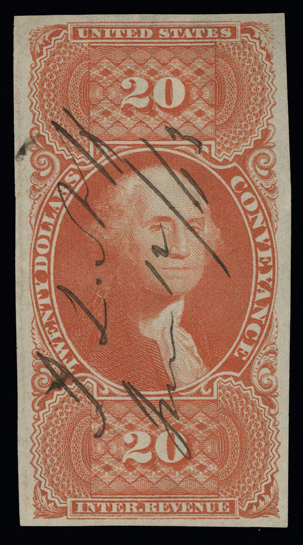 #R98a, $20.00 Conveyance, imperforate, wonderfully bright and fresh used example, with lovely vibrant color and a crisp impression, large to huge margins all around, neat ms. cancel dated 1863, extremely fine; a difficult stamp in this choice quality; 2013 PF certificate.