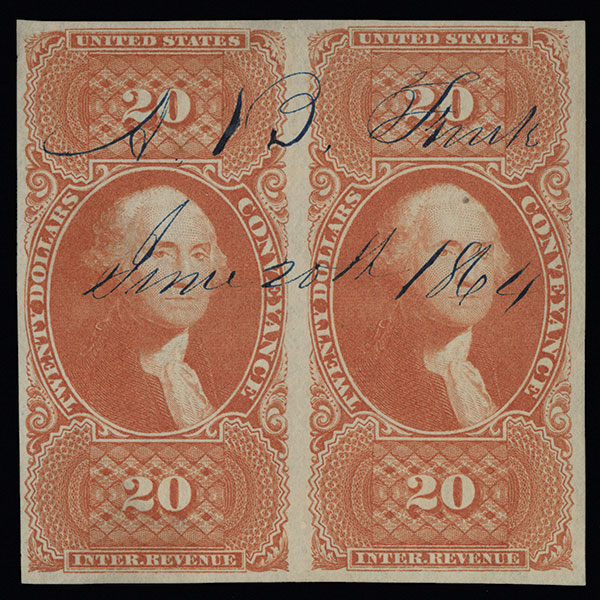#R98a, $20.00 Conveyance, imperforate, beautiful horizontal pair, exceptionally bright and fresh color and detailed impression, large to huge margins all around, attractive full ms. cancel across both stamps dated 1864, insignificant tiny corner margin crease at top left, extremely fine and an impressive pair; 2013 PF certificate.