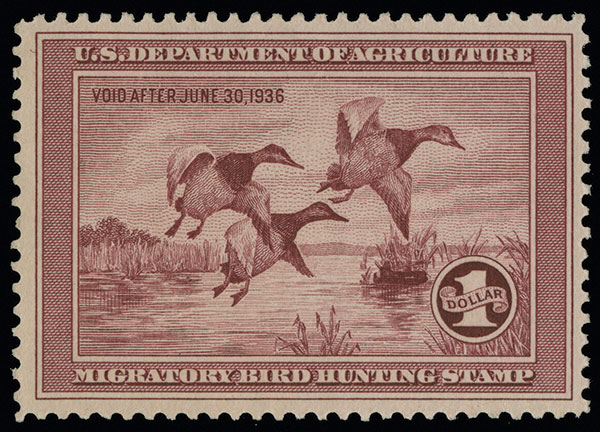 #RW2,1935 $1.00 Rose lake, excellent centering, strong rich color, pristine o.g., n.h., extremely fine.