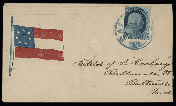 #24, 1c Blue, Ty. V, s.e. at left, tied to Confederate seven-star flag patriotic cover, local usage to newspaper tied by blue "Baltimore/MD/Aug 7" c.d.s., very fine usage; a pretty and rare federal posting by a Confederate sympathizer; 1977 C.S.A . certificate.