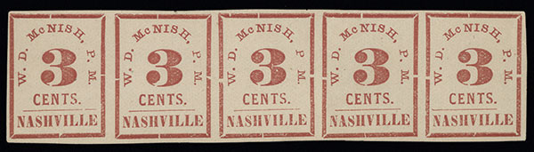 #4AX1, Nashville, Tenn., 3c Carmine, without gum as issued, horizontal strip of five comprising the complete setting showing all five varieties, ample to wide margins all around, bright color, very fine and choice; quite rare in completely sound condition as most of the few known strips have small faults; 2012 PF certificate.