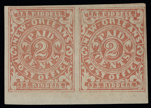#62X2, New Orleans, La. 2c Red, striking bottom margin horizontal pair, ample to large margins all around, bright color on fresh paper, full o.g., lightly hinged, extremely fine and rare in this outstanding quality; 2008 PF certificate.