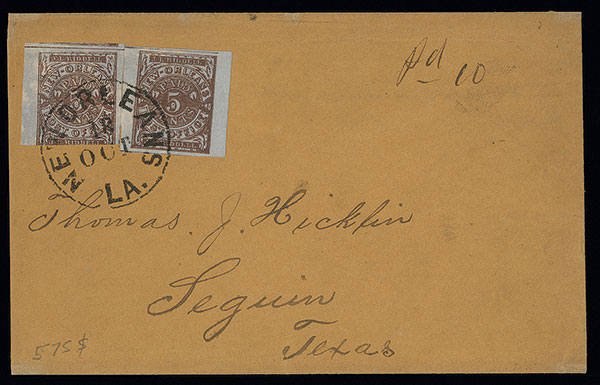 #62X4, New Orleans, La., 5c Red brown on bluish Postmaster Provisional, two singles each with sharp clear impressions, the right stamp with large to huge margins all around, the left stamp with three large margins, just in at bottom, tied to neat cover to Sequin, Texas by full strong strike of black "New Orleans/LA /18 Oct" c.d.s., ms. "Pd 10" at right, an exceptionally fresh cover slightly reduced at left, very fine and handsome.