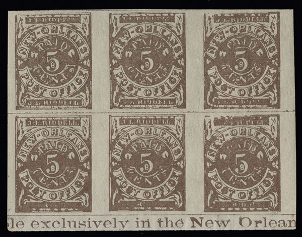 #62X5, New Orleans, La., 5c Yellow brown on off-white, lovely bottom margin partial imprint block of six (3x2), large margins all around, remarkably fresh with rich color and sharp impressions, full original gum, lightly hinged, positions 1, 2 and 5 are never hinged, extremely fine; a beautiful position piece; 2012 PF certificate (catalog value is for a block of four and a pair).