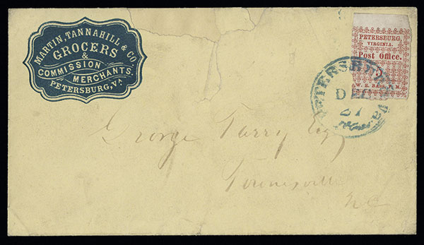 #65X1, Petersburg, Va. 5c Red, top margin single, just in at left, neatly tied to negative shield corner card cover of "Martin, Tannahill & Co./Grocers/& Commission Merchants./Petersburg, Va" by blue "Petersburg, Va./Dec27" c.d.s., expertly repaired at top from rough opening not affecting stamp or markings, very fine appearance and a scarce advertising usage.
