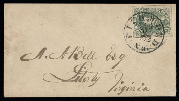 #1, 5c Green, Stone 1, white shirt variety, with four large balanced margins, tied to cover to Liberty, Virginia by neat "Richmond/Va./Dec 20 1862" c.d.s., cover with lightened edge stain at left, very fine and attractive cover; 2013 PF certificate.